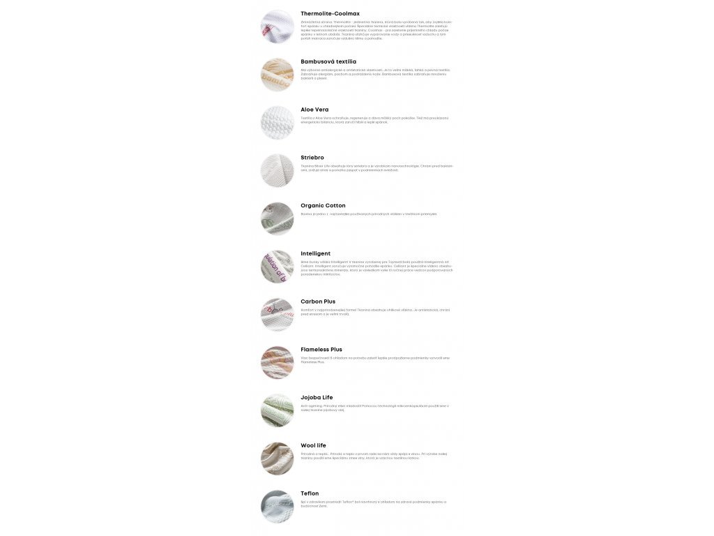 Textília z Aloe Vera, ktorá ochraňuje, regeneruje a dáva mäkký pocit pokožke. Tiež má preukázanú energetickú bilanciu, ktorá zaručí hlbší a lepší spánok - ľahko vymeniteľná (zipsové odopínanie), hygienická (s možnosťou prania). Antibakteriálny návlek vyššej triedy.