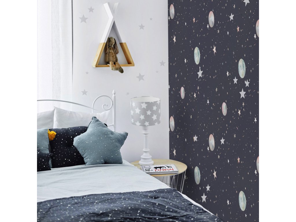 Tapeta DEKORNIK Galaxy z kolekcie Dekornik 2023 od výrobcu Dekornik je určená pre použitie v detskej izbe. Rozmer pásu tapety je 100 x 280 cm. Cena je uvedená za jeden pás tapety. Tieto pásy sa hodia do každého štandardného bytu. Keďže je tam ďalších 20 cm dĺžky voči deklarovanému rozmeru, môžete ich dĺžku upraviť na výšku vašej steny. Objednávanie tapiet v pruhoch je rýchlejšie a jednoduchšie. Stačí zmerať stenu a objednať počet pruhov, ktorý potrebujete. Už nebudete potrebovať rozsiahle odborné konzultácie. Tu sa nemôžete pomýliť. Pruhy tapety zaručujú, že tapeta bude takmer dokonale sedieť na šírku steny. A čo viac, opakujúci sa vzor, kde každý z pruhov vyzerá identicky, umožňuje, aby sa prvky vzoru bezchybne usporiadali na stene, akonáhle nalepíte tapetu od stropu. Tapety sa vyrábajú zo špeciálneho materiálu, ktorý krásne reprodukuje farby. Je odolný, matný a snehovo biely. Materiál je certifikovaný ako nehorľavý a spĺňa všetky požiadavky Európskej únie. Papier nie je samolepiaci, preto na jeho aplikáciu odporúčame použiť lepidlo bez rozpúšťadiel. Pred aplikáciou tapiet akúkoľvek stenu dôkladne napenetrujte a očistite od prachu alebo mastnoty. Tapety značky Dekornik je možné aplikovať na steny až po cca 20 dňoch od poslednej maľby.