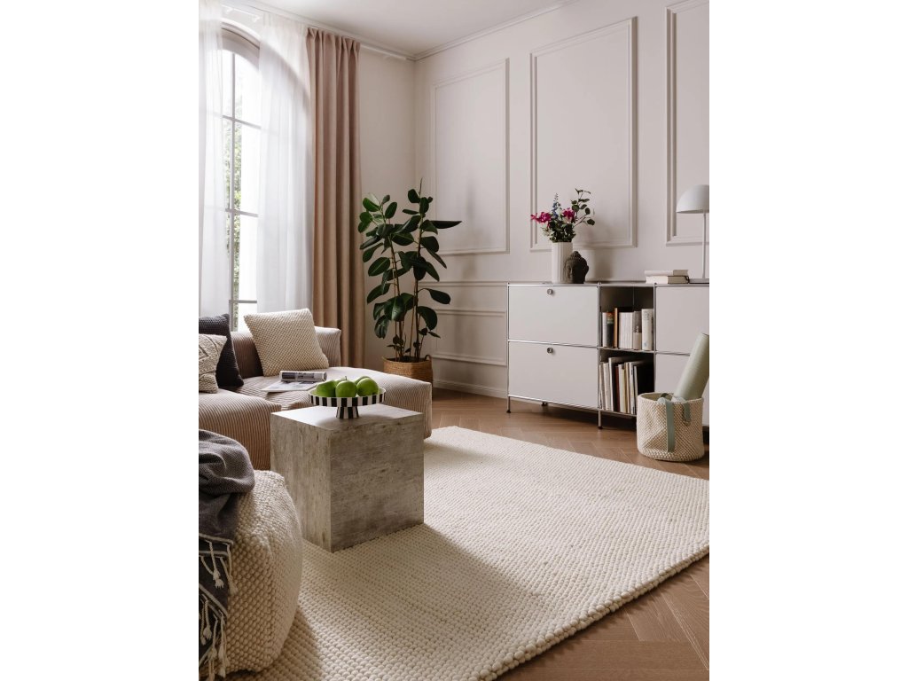 Koberec MOOD SELECTION Beads Cream patrí medzi ručne vyrábané produkty. Je vyrobený z materiálu 70% Vlna 30% Polyester. Rozmer koberca je 120 x 170 cm.