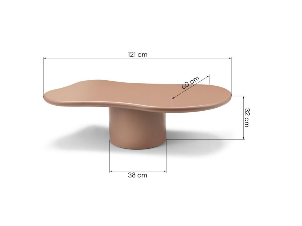 Tento konferenčný stolík škoricovej farby je ideálnou voľbou pre tých, ktorí chcú svojmu interiéru dodať nádych elegancie a modernosti. Jeho teplý tón a organicky tvarovaná vrchná časť vytvárajú útulnú atmosféru, zatiaľ čo sochársky oválny základ a asymetrický dizajn z neho robia jedinečný ústredný bod v každej miestnosti.