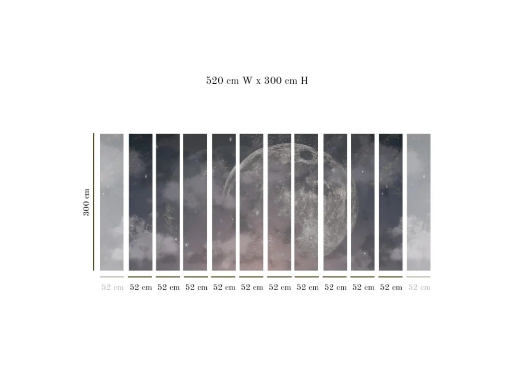 VLADILA Moon Dust - tapeta z kolekcie The Book of Sky značky VLAdiLA v rozmere šírka - 520 cm x výška - 300 cm vyrobená z hladkého vliesu s digitálnou potlačou. Tapeta sa skladá z 10 roliek veľkosti 52 x 300 cm a v prípade záujmu je možné vyrobiť aj tapetu na mieru presne podľa veľkosti steny. Príďte si pozrieť naživo vzorky tapiet ktoré máme k dispozícii v showroome v R1 centre v Bratislave, kde vám poradíme aj s výberom a inštaláciou. V prípade záujmu si viete objednať aj malé vzorky, ktoré vám zašleme domov - kontaktujte nás e-mailom s dopytom.